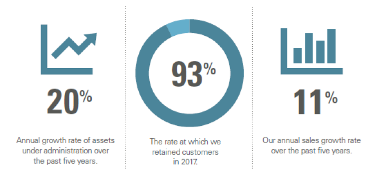 The enterprise grew its assets under administration to $83.0 billion (from $74.1 billion) and maintained a 93 percent customer-retention rate. Also, nearly all key financial metrics sustained record marks in 2017, demonstrating continued financial strength.